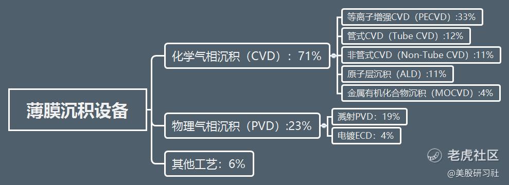 AMAT由薄膜沉积设备起家,经过几十年的发展,2018年,公司的薄膜沉积产品占全球PVD(物理气相沉积)和CVD(化学气相沉积)设备市场份额分别为85%和30%。
