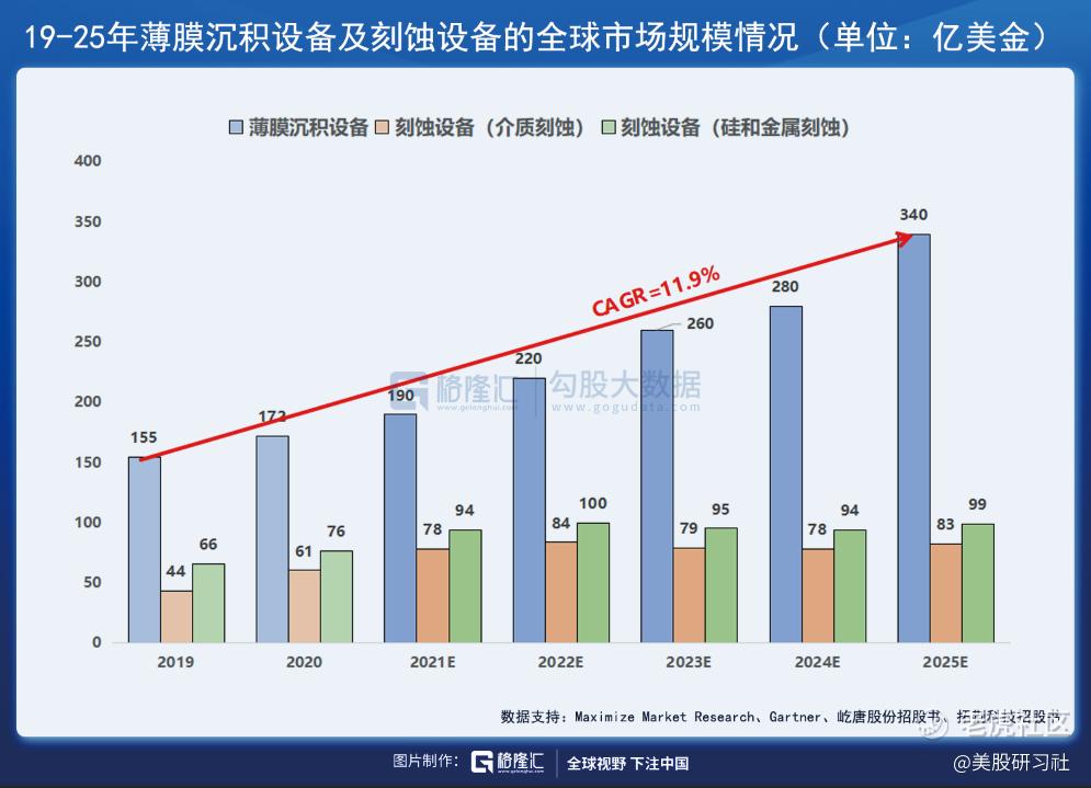 作为前道制造三大主设备之一,薄膜沉积设备在晶圆产线各类设备中的价值占比稳定在20%以上,未来市场空间增量较大。据Maximize Market Research,20 年全球薄膜沉积设备市场规模约为 172 亿美元,CAGR达11.2%。未来,随着集成电路制造业产能扩张、产品升级和工艺制程节点的突破,薄膜沉积设备市场规模将迎来高速增长期,25 年市场规模有望达到 340 亿美元,7年CAGR为11.9%。