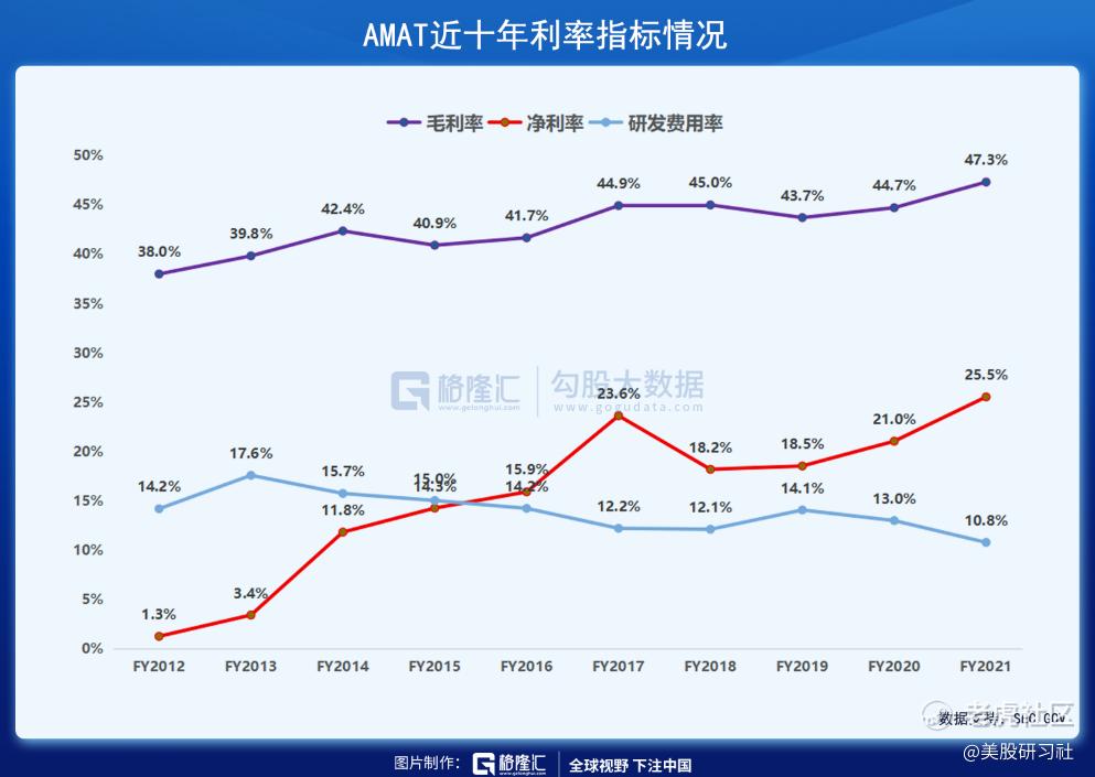 由于工艺制程的进步,客户和设备逐步减少,因此,半导体设备商必须尽可能利用好现有的设备模组,同时还要不断研发新的制程技术以绑定全球领先的晶圆代工厂商。AMAT在研发费用投入方面不遗余力,近十年(FY12-FY21)累计研发投入(每年研发费用率达 10%以上)达175.45亿美金,不断更新产品型号,以适应更复杂的晶圆加工要求,产品毛利率和净利率也得到了改善,呈稳步上升趋势。