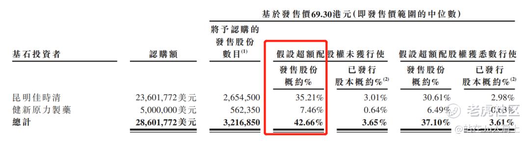 公司引入2名基石投资者,合共认购2,900万美元(约2.23亿港元),其中包括昆明佳时清认购2,360万美元、健新原力制药认购5,00万美元,按中间价计算,约占发售股份42.66%,假设超额配售权未获行使,禁售期6个月。