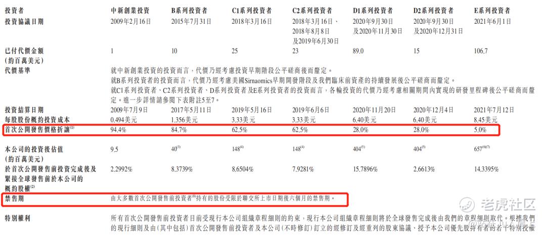 公司于2009年2月至2021年6月曾进行多轮融资,彼时发售价较中间价折让约94.4%至5%,设立6个月禁售期,其中前期投资者包括苏州市人民政府旗下中新创业投资、非执行董事戴晓畅博士、旋石基金、嘉兴华控、越秀二期基金等。