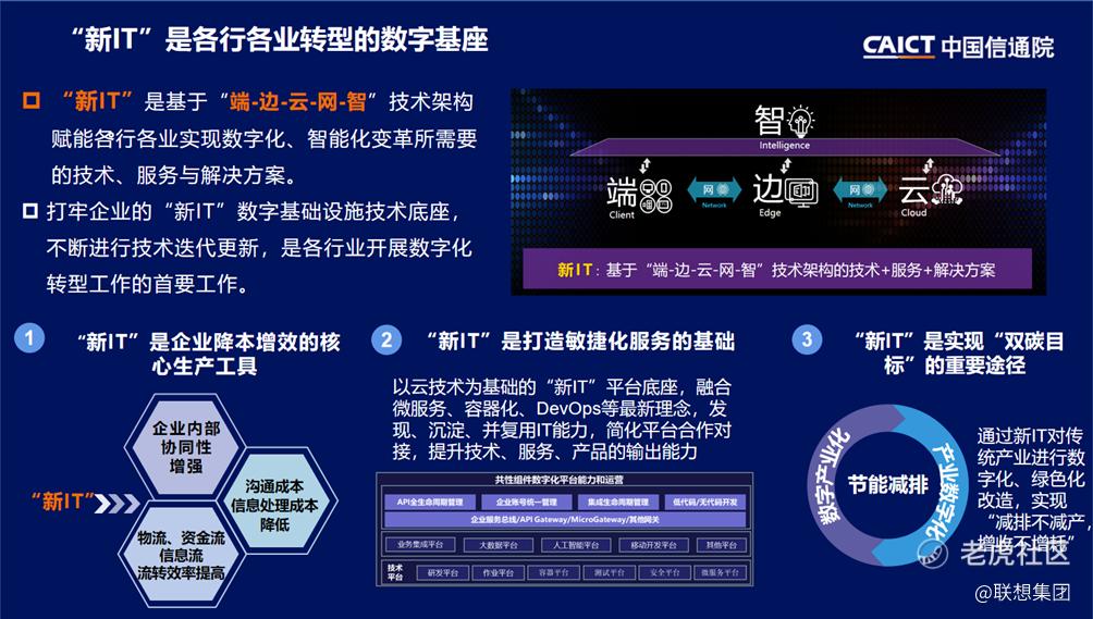 12月20日,“2022中国信通院ICT+深度观察报告会”正式举行。开幕当天,《企业数字化转型蓝皮报告——新IT赋能实体经济低碳绿色转型》隆重发布。报告指出,“新IT”是各行各业转型的“数字基座”,能发挥帮助企业降本增效、打造敏捷化服务、减少能耗和碳排放的重要价值,赋能实体经济数字化转型。