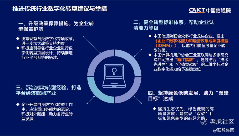 报告指出,企业在推进传统行业数字化转型的过程中,应注重自身能力的沉淀,积极对外赋能。联想集团在推进自身供应链交付智能化、工厂智能化和物流智能化的同时,还基于在相关领域的实践,提炼总结出指导制造智能化转型的体系框架,发挥数字化转型企业的“灯塔”效应,引领行业转型升级。