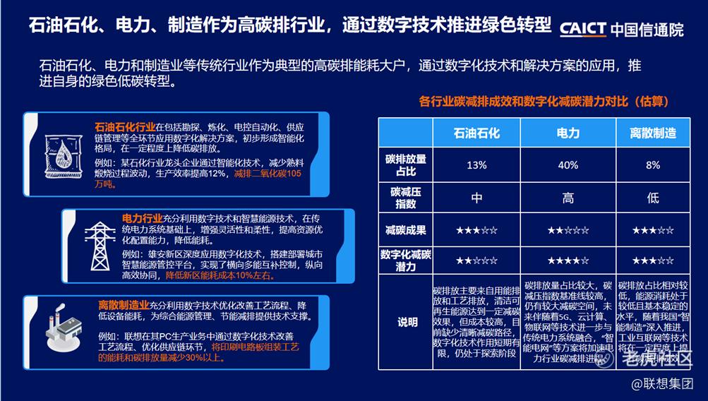 随着数字技术在资源、能源和环境领域的深度融合与应用创新,其在实现碳中和目标中的作用日益凸显。石油石化、电力、离散制造业作为最为重要的几大排碳行业,分别处在能源生产、调配、利用三个环节。报告指出,数字化转型正成为各行业驱动产业绿色低碳改造、实现节能降耗减排的重要引擎。