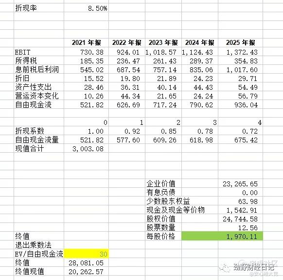 上一篇pe估值法下估值为2万亿至3万亿合理区间,本篇DCF估值的大致区间为1.8万亿至3.15万亿。合理范围有所扩大,目前股价也和假设EV/自由现金流倍数为30倍时的每股1970元估值。