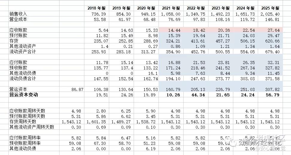 对营运资本变动则相对复杂些,需要五年数据。同时我们需要对流动资产和流动负债各明细项进行预计。预测的基础是对运营效率假定相对稳定,也就是使用近几年的运营效率指标推算。我这里采用了近三年平均,如果要更精确,则需要更充分的了解给出未来四年更细致、更精准的预计。