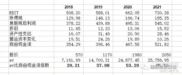 股价和市值用的是该年年底的时点数据并未进行加权平均。可见EV/自由现金流倍数除2018年外都很高,在37-53水平。