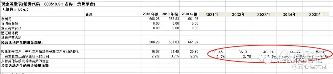 茅台经营活动比较好预计,没有什么其他金融活动,大部分取值都是最近三年平均比例。上图黄色部分稍微有点不对,因为应该是先假设计算好资本性支出,再根据固定资产和无形资产的折旧率计算。这里简单化处理了。