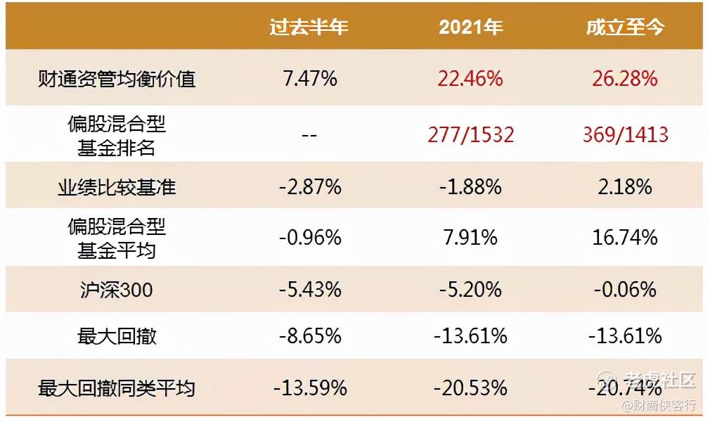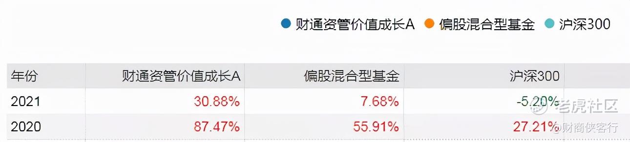 基金成立于2019年3月25日,在不到三年的时间内,已经录得了216.44%的回报率,分年度来看,在2020年和2021年,财通资管价值成长A的回报分别是87.47%和30.88%,相比沪深300和偏股混合型基金的表现,超额收益非常明显。
