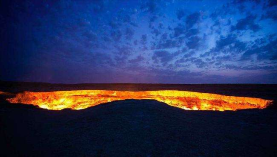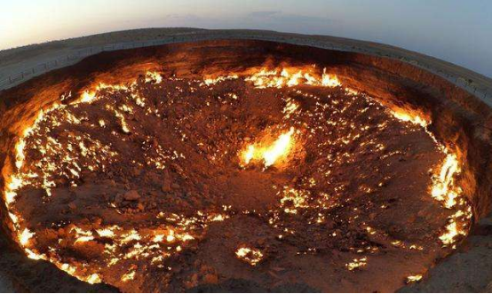 卡拉库姆沙漠,位于中亚国家土库曼斯坦首都阿什哈巴德以北约260公里的达尔瓦扎地区,这里常年干旱、人迹罕至,但在这漫漫沙漠中部却存在着一个巨大的火焰圈,被当地人称为“地狱之门”。