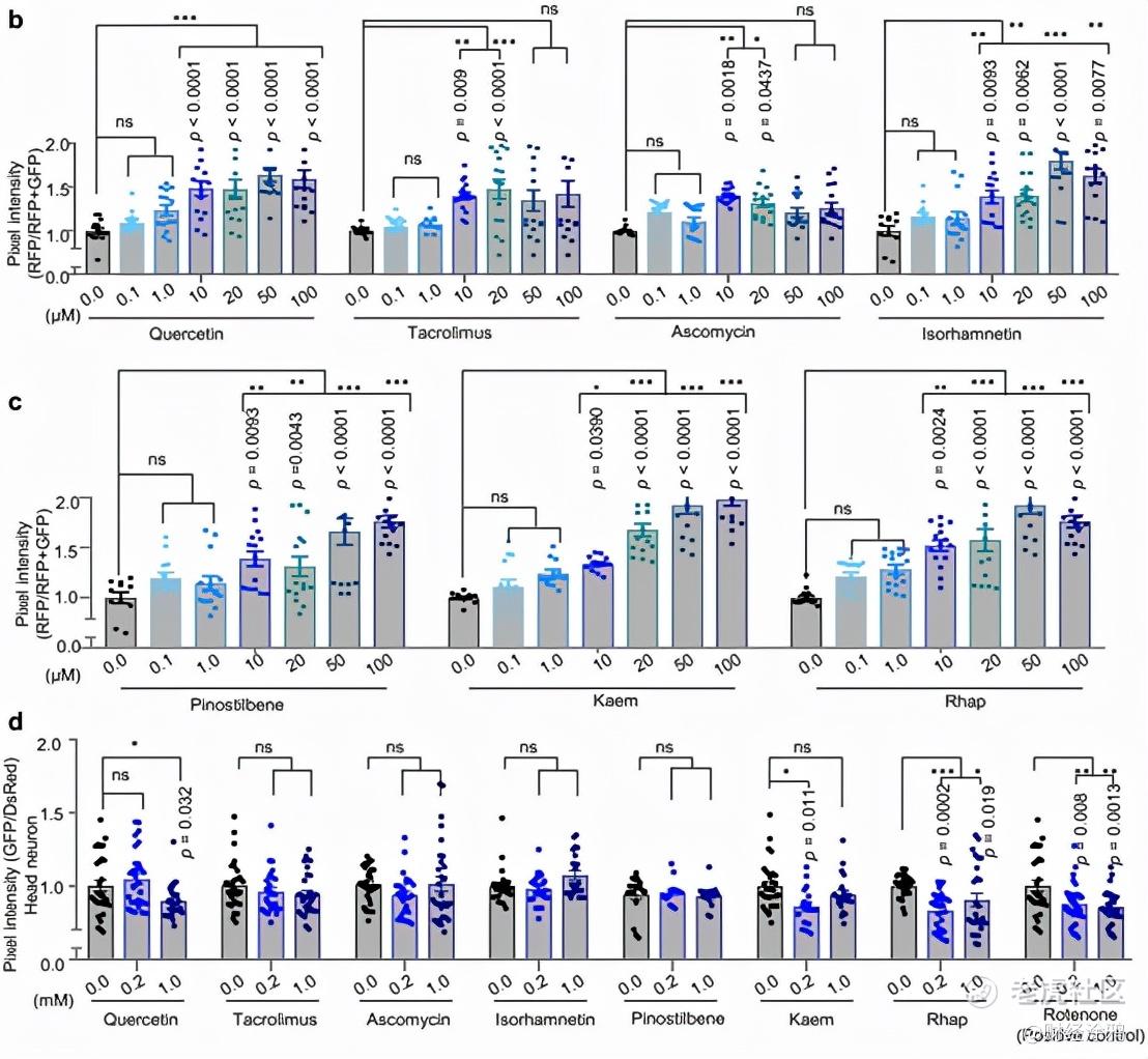 研究团队使用人类赫拉细胞模型和线虫动物模型验证了这些小分子的自噬诱导作用,发现其中8种小分子(槲皮素、槲皮素二水合物、他克莫司、子囊霉素、异鼠李素、松芪、山奈酚和丹叶大黄素)在10μM浓度时有明显的诱导线粒体自噬作用。进一步研究表明,异鼠李素、松芪、山奈酚和丹叶大黄素这4种小分子能以剂量依赖性方式诱导线粒体自噬(图二)。