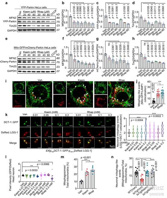 随后,研究团队使用了一种神经元中表达Rosella的转基因线虫来评估小分子的体内自噬激活效果。通过向转基因线虫模型中分别补充0.2 mM 和 1.0 mM 的不同的天然小分子化合物并分析其线粒体自噬水平,研究人员发现,槲皮素(1 mM)、山奈酚(0.2 mM)和 丹叶大黄素(0.2 mM 和 1 mM)能够在线虫中诱导神经元自噬。同时,免疫印迹表明,山奈酚和丹叶大黄素能降低MFN2(线粒体外膜蛋白)和Tim23(线粒体内膜蛋白)的表达,并增强了线粒体与 LAMP1 抗体标记的溶酶体的共定位,表明线粒体的溶酶体降解增强。另外,研究人员也在野生型和AD模型小鼠脑组织海马区域中观察到了明显的线粒体自噬增强。至此,研究团队通过AI模型成功发现了两种有明显线粒体自噬诱导作用的天然小分子(图三)。