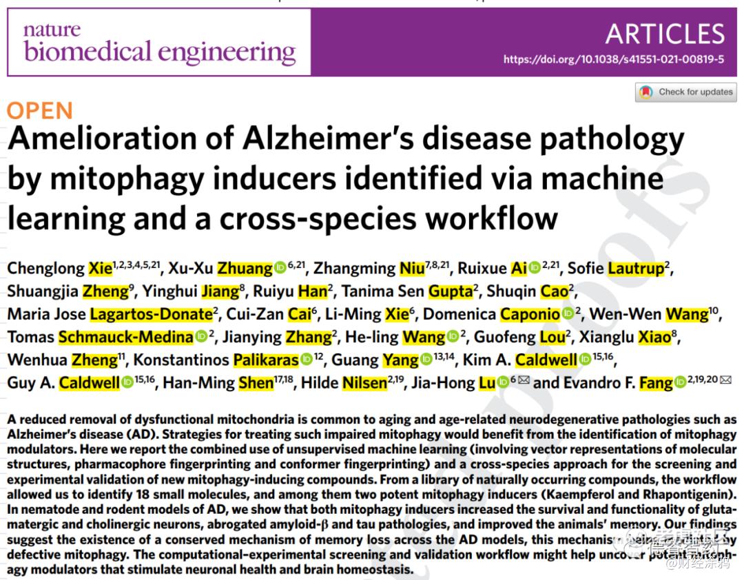 据《财经涂鸦》消息,近日,AI驱动的药物研发公司德睿智药与奥斯陆大学、澳门大学、帝国理工等团队在影响因子25.6分的顶级期刊《Nature Biomedical Engineering》发表研究“Amelioration of Alzheimer’s disease pathology by mitophagy inducers identified via machine learning and a cross-species workflow”。其中,数位德睿智药团队成员负责该研究AI模型的开发与验证,并且为该论文的共同第一以及第二作者,挪威奥斯陆大学Evandro Fei Fang教授团队和澳门大学路嘉宏教授团队负责了该研究的研究设计与生物学实验验证。该研究建立了一种基于人工智能(AI)融合多维分子信息的虚拟筛选算法,并结合细胞、线虫、小鼠多物种阿尔兹海默病(AD)模型验证,成功快速筛选获得具有AD治疗潜力的中药小分子化合物。该研究针对AD治疗,提出了一种高效可行的基于AI的药物发现方案,为快速开发抗AD药物提供全新策略。