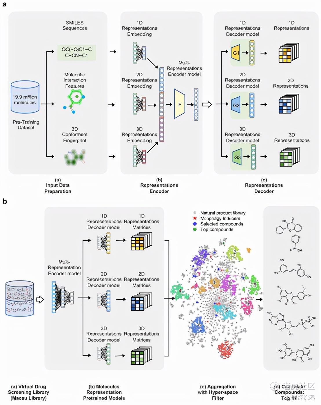 在这项研究中,研究团队引入了机器学习方案,为了获得全面的分子表征,对每个分子的一维、二维与三维信息进行了表征学习(图一)。预训练的数据来自ChEMBL和ZINC的共一千九百万小分子数据,并且预训练表征模型创新性的考虑了分子的各个维度的信息:一维特征为分子SMILES序列特征,二维特征主要为分子交互特征,三维特征主要为3D Conformer分子指纹。基于预训练模型所获得向量,研究团队对澳门大学天然分子数据库和14个已知的线粒体自噬诱导剂进行了聚类与过滤,共筛选出18个天然小分子进入湿实验验证阶段。整体模型构建时间小于14天。