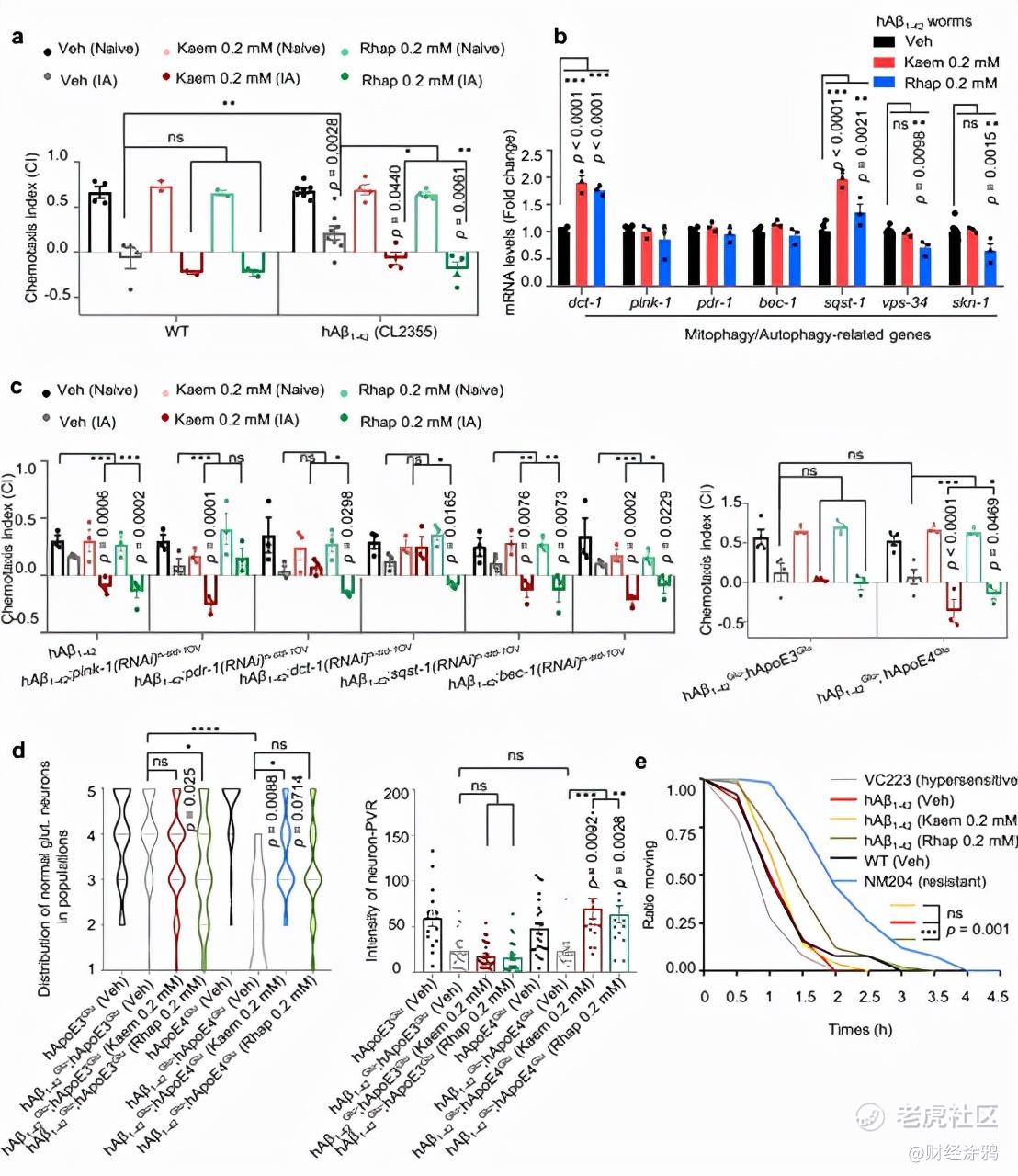 在进一步试验中,研究人员继续使用山奈酚和丹叶大黄素对过表达Aβ和Tau的线虫动物模型进行治疗,发现治疗后线虫的学习行为得到明显改善(图四),并且这两个分子都调控了如pink-1、pdr-1、dct-1、sqst-1、bec-1等自噬关键调控基因的表达。