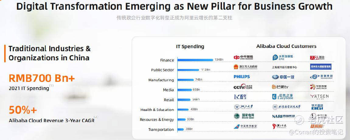云计算本地收入为200.07亿,同比增长33%,占收入比重为10%。考虑到去年底字节开始自己做云业务,阿里云因此有一部分收入减少,实际增速还是快于33%(在2021年2Q阿里云收入增长是29%,在剔除单一客户离开因素后,收入增长是在约40%左右)。阿里云快速增长,一个主要原因是云计算无论是在中国,还是全世界,都越来越成为生活中离开的产品,也就是计算平台的云化。我用一个实际例子来说明,云计算给公司做业务和大家生活带来的好处。雪球在发展的前中期有一段时间是运维是有5-6个人,自己组服务器,晚上还需经常加班,运维组还要经常担心服务器是否出现宕机,大流量突入导致延迟或无法登陆等等问题,以及服务器出现问题导致数据损毁。雪球在服务器上阿里云后,只需要2个人维护,而且大流入突入导致延迟和无法登陆,宕机等情况都大幅减少。云计算业务本质,就是由阿里巴巴这样组建超级大的服务器群,并且在多个地区服务器群里进行数据备份防止灾备。大服务器群,让每个公司用一组服务器的成本都在下降,而且效率还提升,因为有大量服务器群存在,所以灾备也提升,可以在不同地区进行存储,防止哪怕一个地区服务器出现损毁,比如一些灾难像地震,导致对公司数据不可修复的毁灭打击,这就是云计算的好处。所以大家在使用雪球的产品,和享受这些高质量的投资社区产品时,是有云计算业务在为整个产品团队提供后勤和保驾护航。