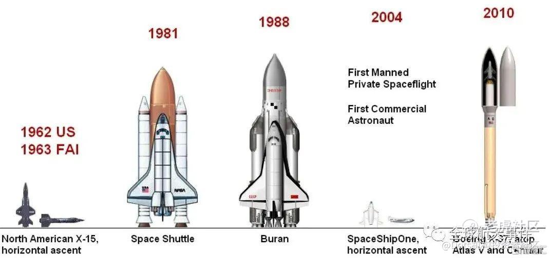美国和前苏联空天飞行器首飞年份(其中两型HTHL飞行器均无法实现轨道级飞行)从左往右分别为美国X-15(HTHL亚轨道)、美国航天飞机(VTHL)、原苏联暴风雪号空天飞机(VTHL)、维珍银河太空飞船1号(HTHL亚轨道)、美国X-37空天飞机(VTHL)