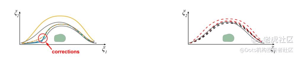 图 | (左)机器原本生成的避障轨迹,红**域表示可能出错的路径;(右)经过患者大脑纠正后的避障路径