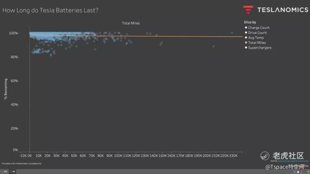 据美国特斯拉车主社区Teslanomics调查数据显示,在其对2636辆特斯拉(包括Model S/X/3)的电池健康状况调查采样中发现,大部分特斯拉汽车行驶16.09万公里(即10万英里)后,电池组仍然保持92%以上有效容量。