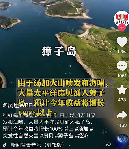 1月17日,《凤凰周刊》抖音官方账号发布一则关于汤加火山爆发的短视频,并配文称“由于汤加火山喷发和海啸,大量太平洋扇贝涌入獐子岛,预计今年收益将增长100%以上。”
