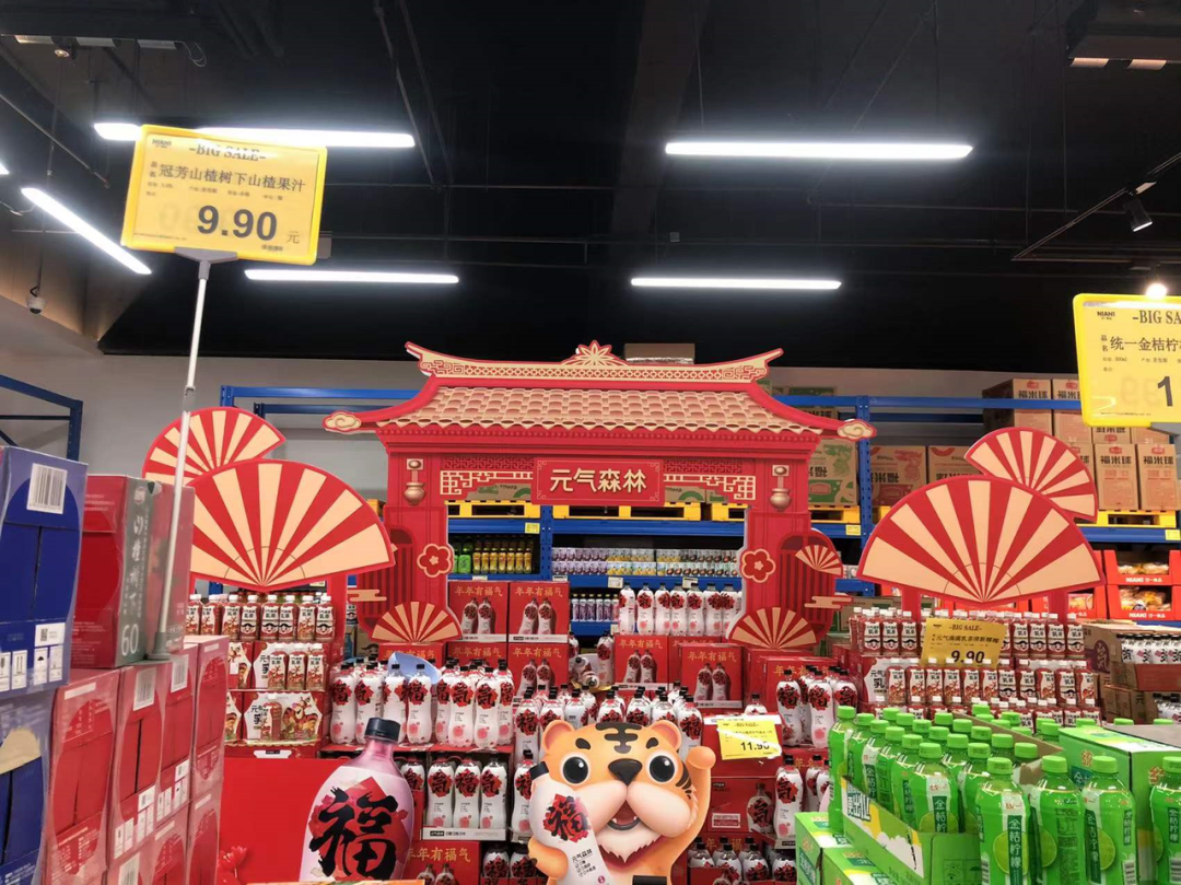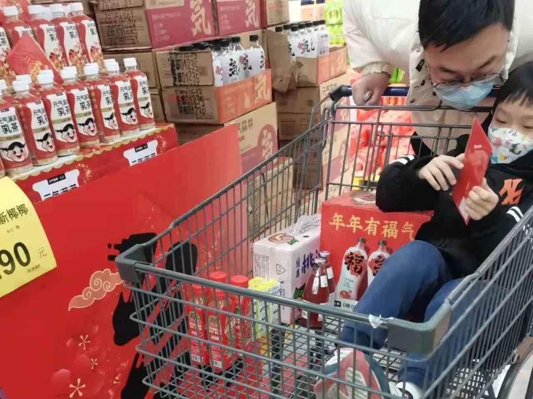 其店内一块4米*2.4米见方的促销展区上,堆满了“福气瓶”、跳跳虎联名元气森林乳茶和区域限定口味气泡水,买两瓶“福气瓶”还赠送一个淘米盆。“这些都是我刚放上去的,之前的被拿空了,有的顾客甚至直接搬走3箱。”