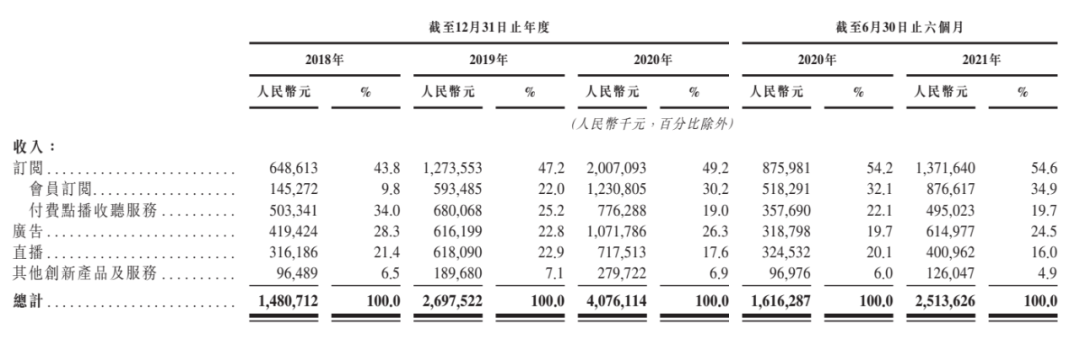 招股书显示,截至2020年6月30止6个月内,直播营收占比甚至超过了广告营收。2019年全年,直播营收也超过了广告营收。