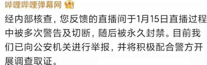 B站也在当晚迅速回应,称该网友反馈的直播间于1月15日直播过程中被多次警告及切断,随后被永久封禁。目前我们已向公安机关进行举报,并将积极配合警方开展调查取证。