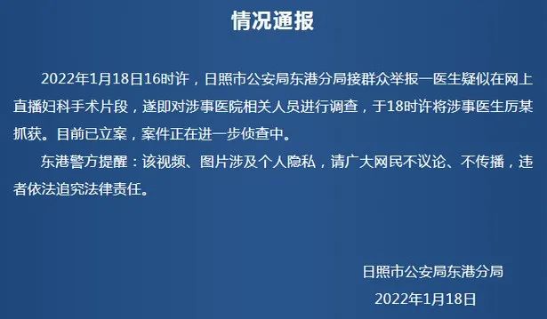 此事被曝光后引发强烈关注,18日晚,日照市公安局东港分局通报,1月18日16时许接群众举报一医生疑似在网上直播妇科手术片段,遂即对涉事医院相关人员进行调查,于18时许将涉事医生厉某抓获。目前已立案,案件正在进一步侦查中。