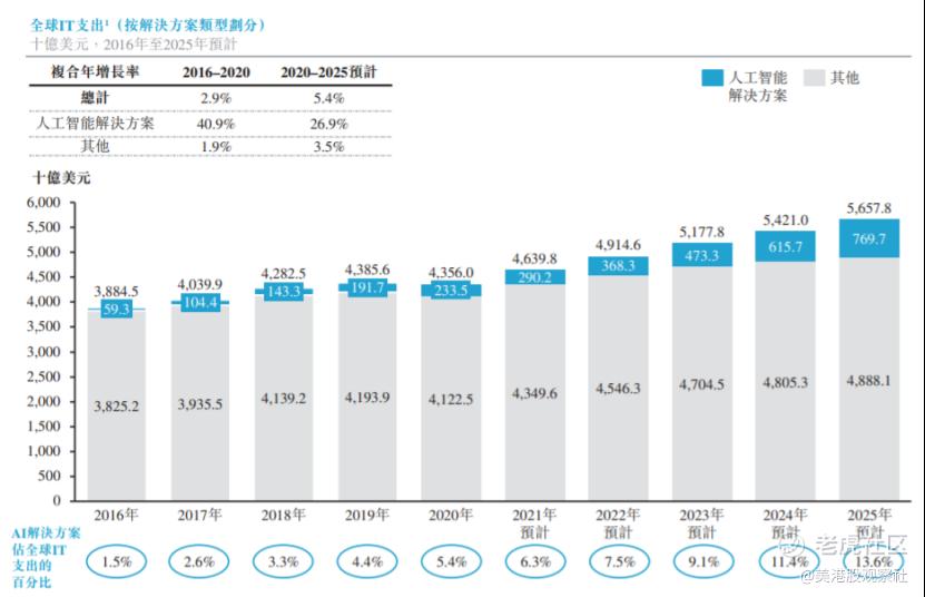 这还不是终点,人们对提高效率的追求是没有止境的,而接下来,就轮到人工智能来帮助提高效率。最近几年AI技术不断成熟,开始落地应用,并且行业接受程度也在加快。这点从全球范围的IT支出就可以看出来,2016年人工智能解决方案占总支出的1.5%,2020年该占比增加到5.4%,预计到2025年还会增加到13.6%。