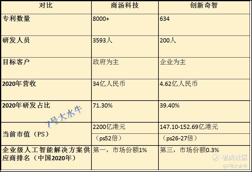 对比商汤科技,市销率52倍,创新奇智市销率26-27倍,看起来创新奇智更低,但是两者在研发投入,专利数量等方面差距较大,创新奇智发行市值偏高。