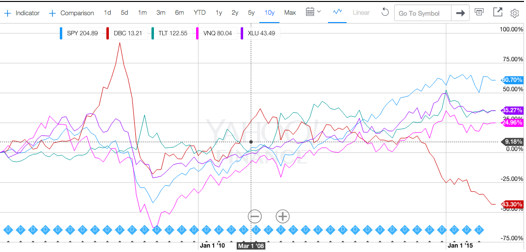 波动最剧烈的是$(DBC)$,也就是大宗商品指数,前两年涨势还不错,但这几年由于原油价格暴跌,矿产有色金属表现也不是很好,我不打算购买它。
