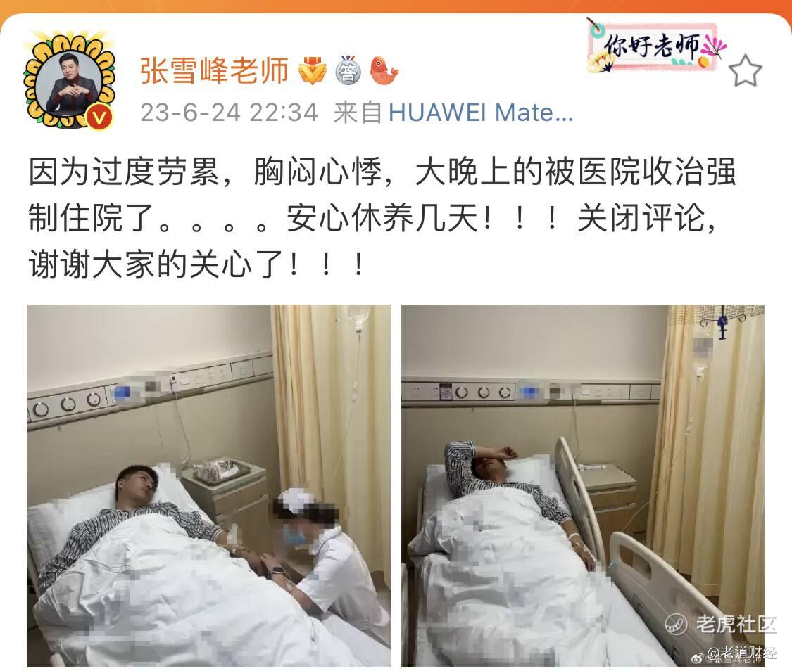 6月24日,张雪峰在个人微博发布动态:因为过度劳累,胸闷心悸,大晚上的被医院收治强制住院了。就在一个星期前,张雪峰因为“闭着眼睛报一个专业都比新闻好。”“孩子非要报新闻学,我一定会把他打晕,然后给他报个别的”言论连上三天热搜。