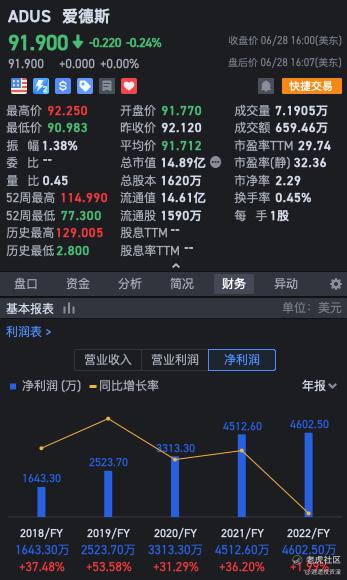 爱德斯(ADUS) 营收、营业利润和净利润均保持了5年增长,平均增速分别为17.4%,24.7%和30.9%。2022年增速分别下降到10%,4.3%和2%。2022年利息费用占营业利润的12.5%,负担略重。2023Q1营收增长11%,营业利润受营业费用较慢的增速支持而大幅增长37.7%,净利润则受所得税增速较慢影响而大增49.7%。