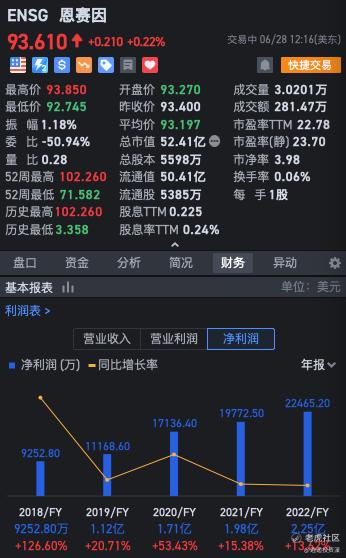 恩赛因(ENSG) 营收5年来保持中高速增长,平均增速13.6%,营业利润也连续增长,平均增速39.4%,2022年增速下降到14%,主要是毛利率下滑导致的,净利润也连续增长5年,近两年平均增速下滑到14.7%。2023Q1营收增长24.3%,营业利润增长8.3%,净利润增长19.7%。