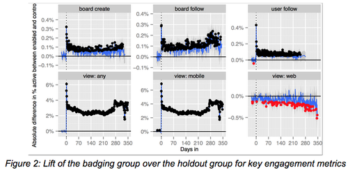 在持续了一年多的实验后,我们发现初始的7%日活提升在几个月后已逐渐下降为2.5%(见下图)。虽然和原来比确实还是增长的,但并不是太大的增长。后来,我们又推出了“Pinterest新闻”,它可以给用户摘要整合他关注的内容,而作为新闻功能的一部分,当有新的新闻出现时,我们也发送提醒给相关的用户,他们的app上就会出现小红圈数字。