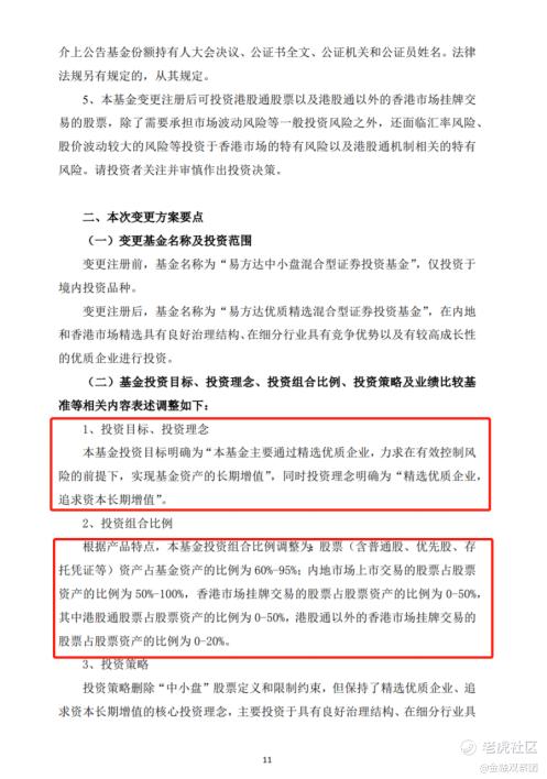其次,扩大投资范围,在仍主要投资于A股的基础上增加港股。基金投资组合比例相应调整为:股票(含普通股、优先股、存托凭证等)资产占基金资产的比例为60%-95%;A股占股票资产的比例为50%-100%,港股占股票资产的比例为0-50%,其中港股通股票占股票资产的比例为0-50%,港股通以外的香港市场挂牌交易的股票占股票资产的比例为0-20%。