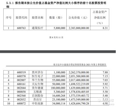 据《易方达中小盘混合型证券投资基金 2021 年第 2 季度报告》,截至2021年6月30日,该基金资产净值为287.01亿元,股票资产市值占基金资产净值的比例为71.07%,其前十大重仓股分别为通策医疗、贵州茅台、恒生电子、华兰生物、天坛生物、美年健康、五粮液、百润股份、苏泊尔和中炬高新。