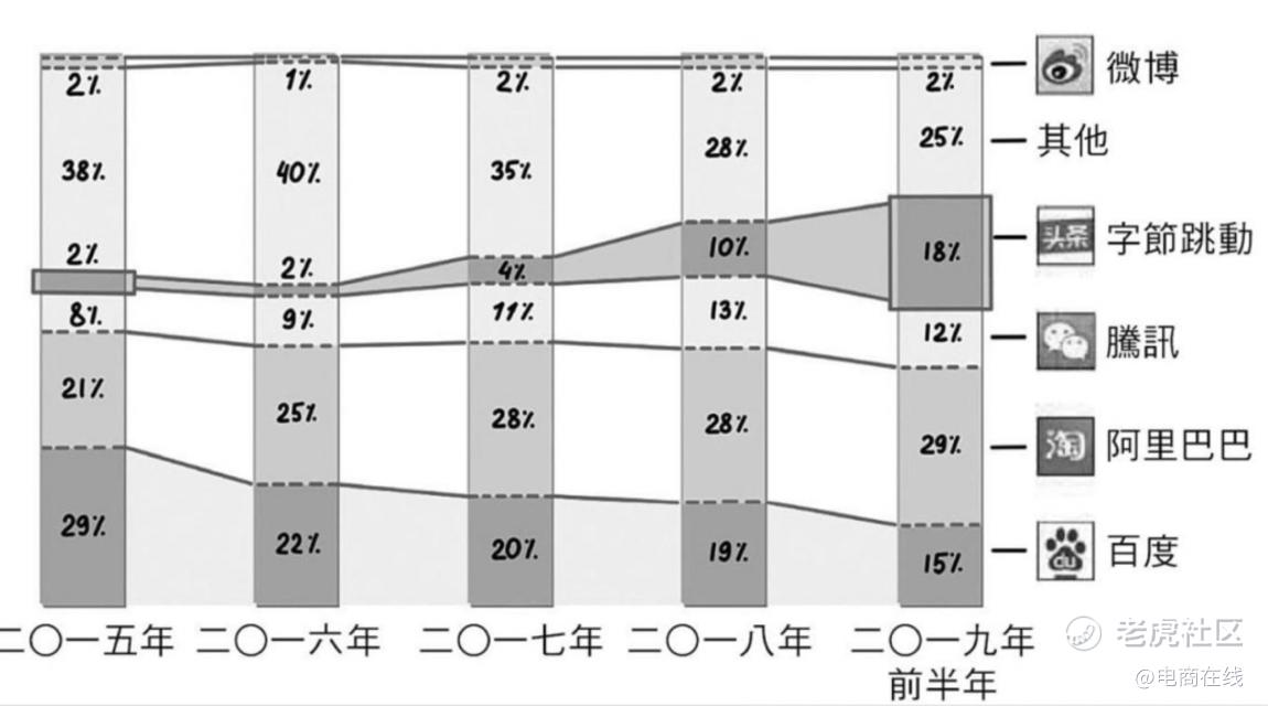 字节跳动更不必说。如今被称为“字节二把手”的张利东,2013年加入字节后,全面负责其商业化相关业务,广告销售团队在两年内从5人扩增到数百人。2020年,字节跳动营收2366亿元,有媒体报道,在中国市场的广告营收超过1800亿元,占比接近八成。