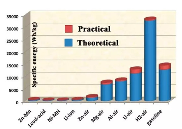 不同种类金属空气电池的比能量