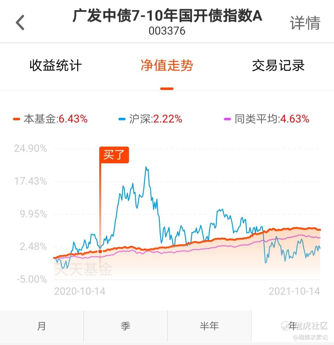 碰巧梅姨当时手里正好有笔闲钱,所以当天反手就买入了一只场外的国债指数基金,也就是广发中债7-10年国开债指数A(003376)。截止今天收盘,这只基金创造了近5%的收益。