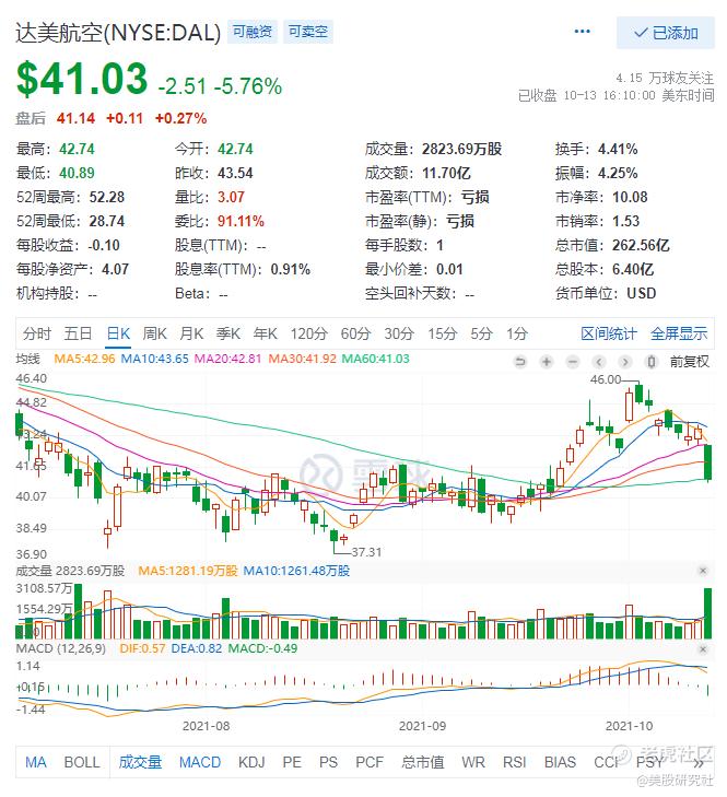 截至发稿时间,达美航空10月13日美股收盘跌5.76%,报41.03美元。
