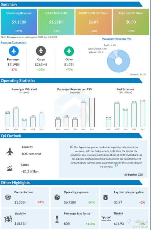 该公司本季度的基本每股净收益为1.90美元,19年同期为2.32美元;摊薄每股净收益为1.89美元,19年同期为2.31美元。谈到本季业绩,该公司CEO巴斯蒂安(Ed Bastian)表示,第三季度对于经济复苏来说是一个重要里程碑,这是自开始疫情爆发以来公司首次实现盈利的一个季度,本季营收已恢复三分之二的疫情前正常水平。