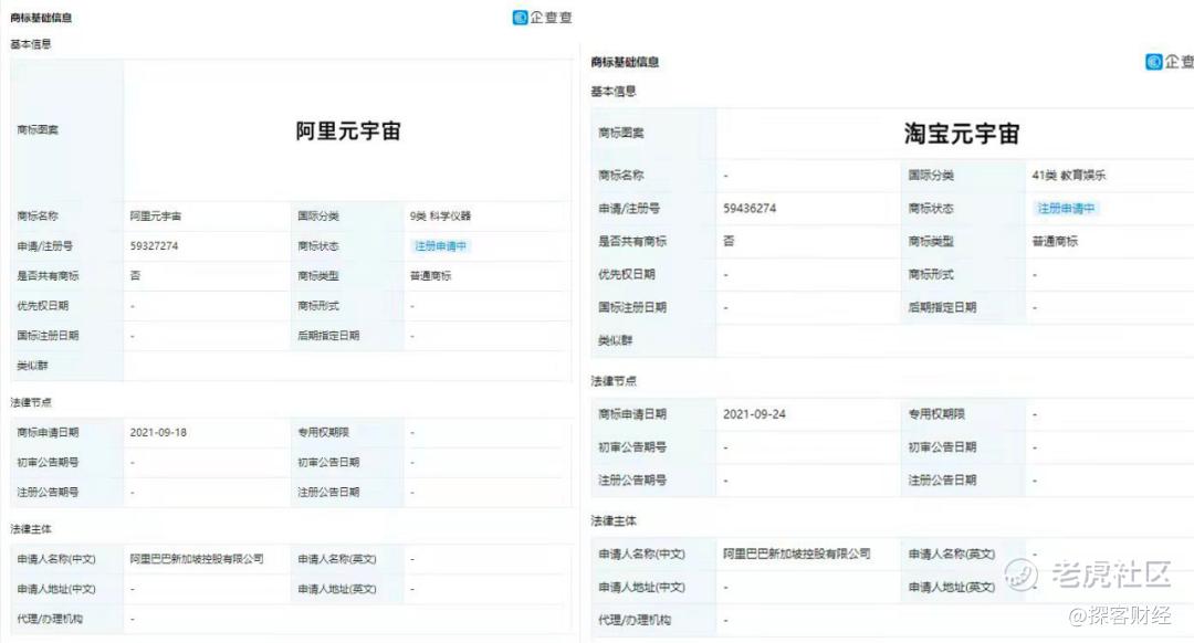 近日,天眼查显示,阿里巴巴新加坡控股有限公司申请注册“阿里元宇宙”“淘宝元宇宙”“钉钉元宇宙”等商标,国际分类涉及科学仪器、广告销售、教育娱乐等,目前商标状态为注册申请中。