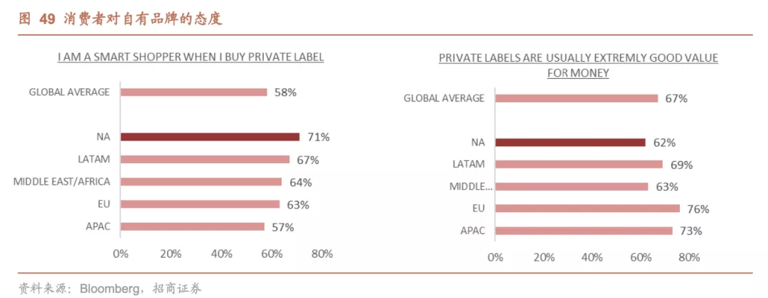质优价廉的自有品牌在消费者中备受青睐。自有品牌便宜,优质,高性价比,并且质量也越来越好,根据尼尔森的调查显示,在卡夫亨氏的主要市场北美地区,高达71%的消费者认为购买自有品牌是聪明之举,62%的消费者认为购买自有品牌更划算。
