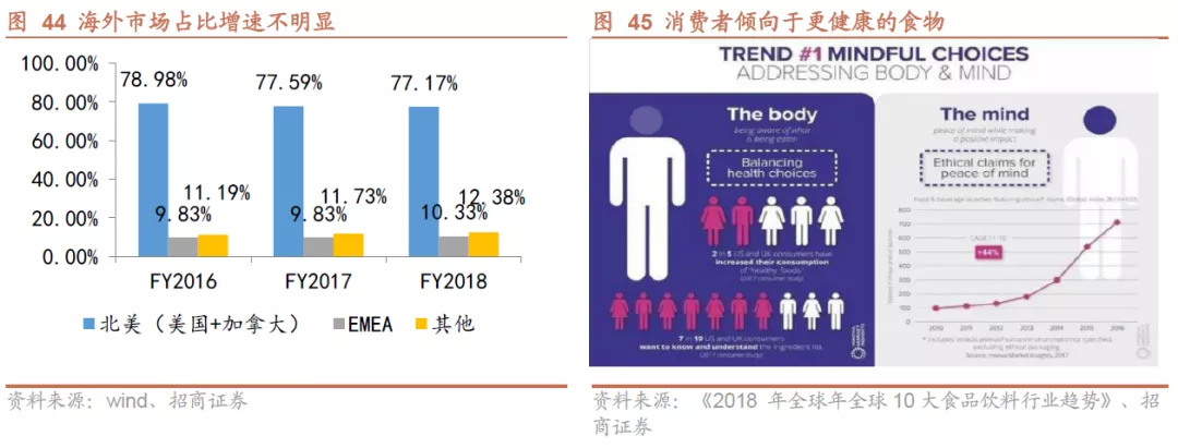 削减成本背景下,公司市场拓展、产品创新不足。在极端缩减成本的策略下,公司应对市场拓展和产品研发的空间相应减少。一方面是市场拓展,2016年卡夫亨氏试图在中国电商渠道推广“绅士”坚果品牌,但并没有成功打开局面,国内龙头仍是三只松鼠、百草味等品牌,卡夫亨氏的营收主要仍然来自于北美市场(美国和加拿大),其他海外市场的2018年销售额占比相较于2016年仅增长了1.81个百分点,无明显变化。另一方面是消费者口味转型,倒逼卡夫亨氏研发健康食物。根据Innova Market Insights报告,近年的消费者口味倾向于更健康的食物,2017 年的调查数据显示40%的英国和美国消费者增加了对健康食品的消费,而面临这股风潮,以高热量、添加剂、防腐剂含量较高的产品 (尤其是奥斯卡梅尼耶品牌)作为主打产品的卡夫亨氏显然不能有效吸引到追求健康的人群。但结果是公司在2018年8月由于含糖量过高,与标签内容不符被澳洲相关部门罚款,侧面反应公司产品应当进行一定的创新。