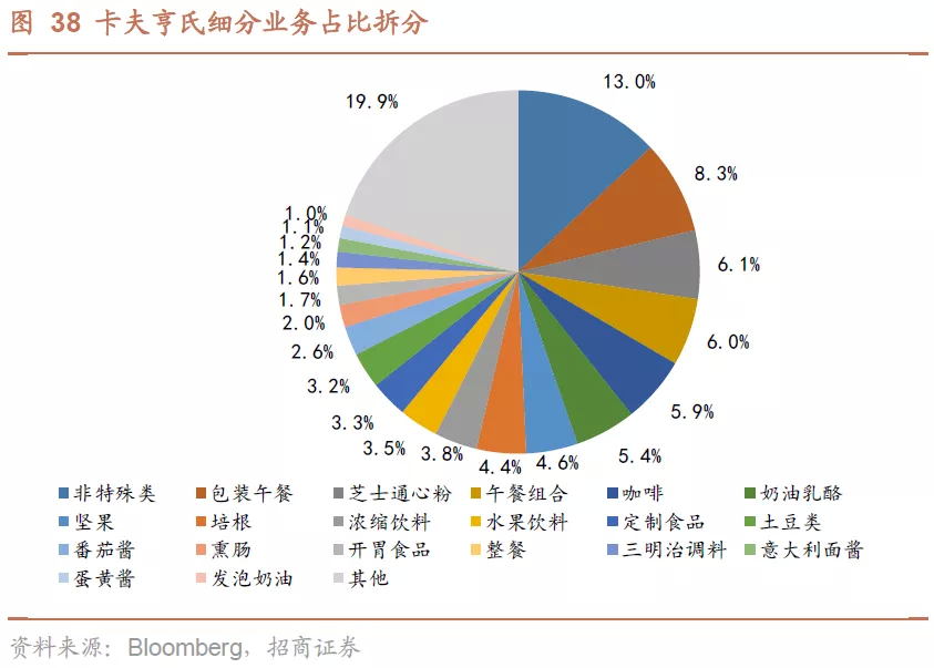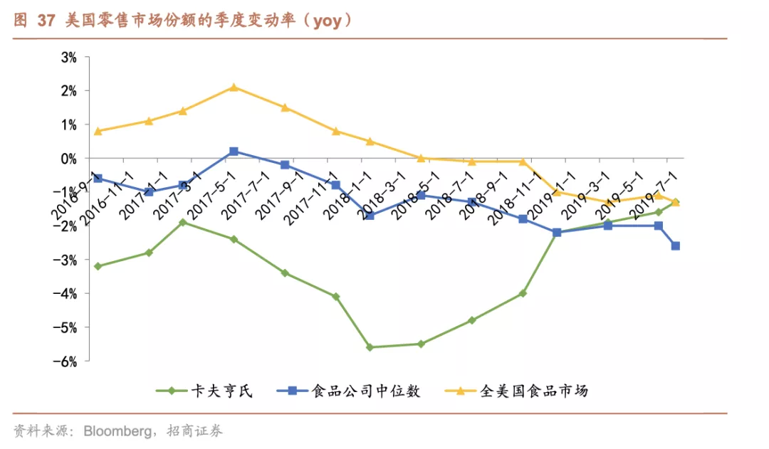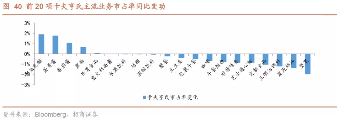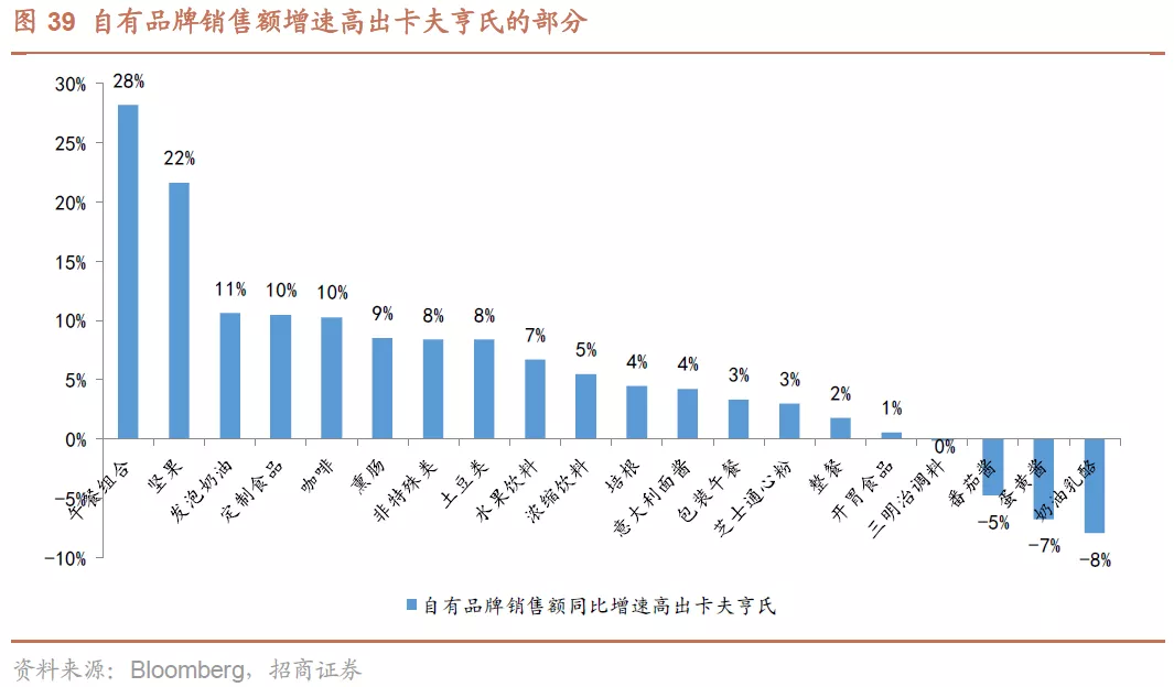 主流业务增速不及自有品牌。公司在美国市场下跌的份额主要是被自有品牌挤占,根据尼尔森报告,在2018年4月至2019年4月间的美国市场,公司占比位于前20名的业务类别中,其中有16项细分业务的销售额增速没有跑赢自有品牌,仅4项细分业务增速超过自有品牌,分别是番茄酱、蛋黄酱、奶油乳酪、三明治调料。其中番茄酱、蛋黄酱、 奶油乳酪是公司的强品牌力产品,尤其是番茄酱具备亨氏品牌的护城河保护,在自有品牌冲击下仍能保持优势地位。但公司其他缺乏品牌力的产品在面对自有品牌时表现乏力,受冲击更大,其中差距最大的是午餐组合,其增速被自有品牌增速超出28个百分点。
