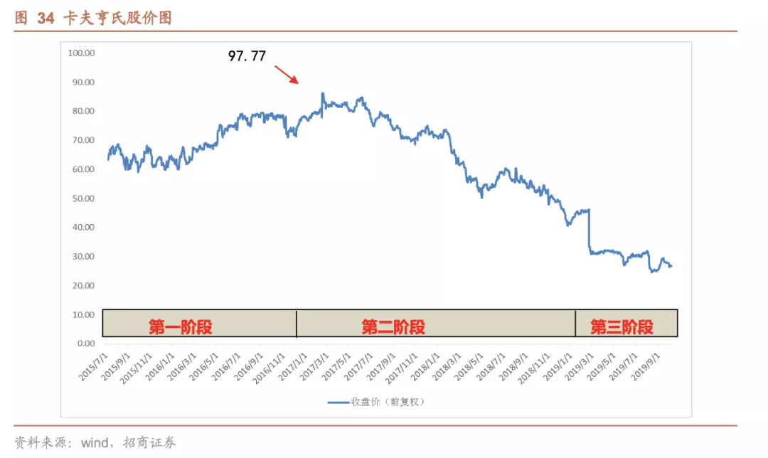 第一阶段: 2017年2月前一路向好。2017年前卡夫亨氏经营尚未暴露问题,股价走势一路向好,在2017年2月卡夫亨氏意欲收购联合利华时达到97.77美元的高点;