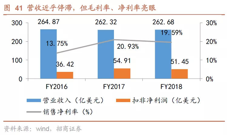 受益于缩减成本战略,公司毛利率、扣非净利率较高。尽管收入端无力,但是由于缩减成本,公司3年间毛利率仍维持在35%左右的水平上,甚至扣非后的净利率表现可以称得上亮眼,2016-2018年扣非净利润分别为36亿美元、55亿美元(按55亿扣除所得税返还)、51亿美元(按 154亿加回商誉减值)。