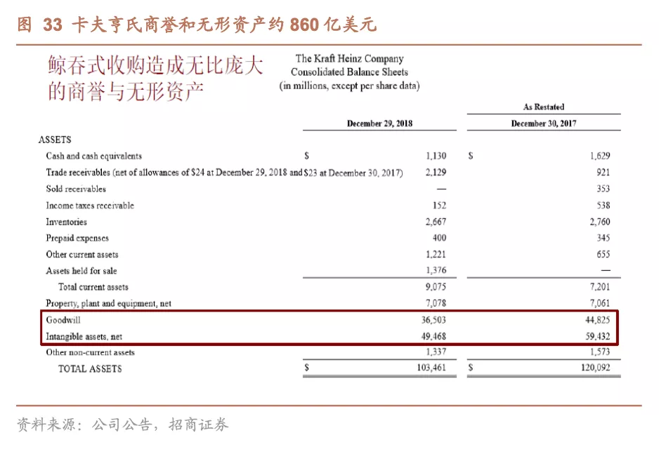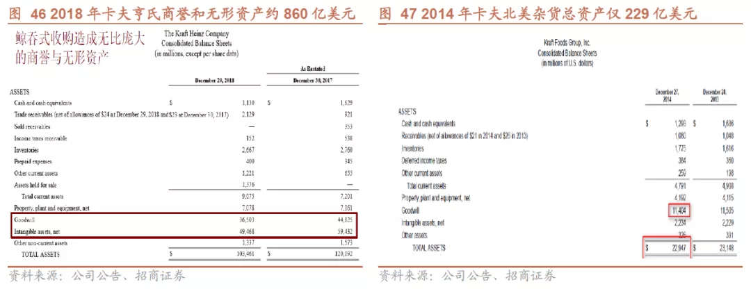 巴菲特在接受CNBC采访及参加股东大会时曾表示,当初为卡夫北美杂货支付了过高的溢价,巴菲特和3G资本于2015年促成了卡夫北美杂货与亨氏的合并,并为此支付了100亿美元,那笔交易对卡夫北美杂货的估值达到626亿美元,而在卡夫北美杂货2014年的财报中,卡夫北美杂货的资产总计仅为229亿美元。当合并后的公司在股市上市时,其估值达到890亿美元。过高的收购溢价除了导致估值过高,也导致商誉和无形资产占比畸高(2018年占总资产83.1%),其后计提154亿巨额减值也就不足为奇了。故而巴菲特称:“卡夫买贵了”,而非媒体转载的“卡夫亨氏买贵了”。