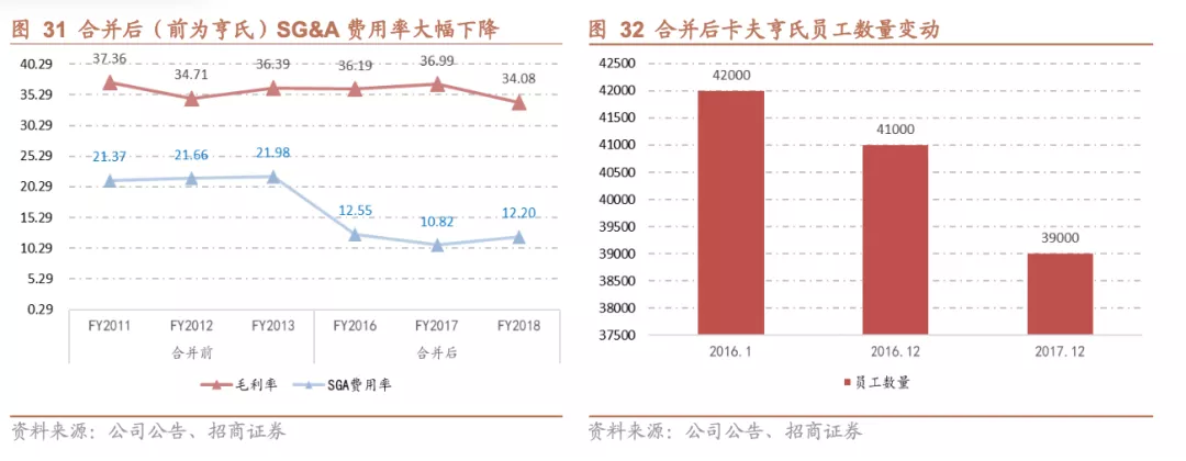 裁员关厂,费用率大幅下降。之后卡夫亨氏经历了大幅裁员、关闭工厂、采取各种手段压缩成本,5万员工中有8000人在第一年就被裁员,使其员工人数减少了16%,并且还有10位高管被撤职,关闭了北美7个效能不佳的工厂。工厂员工主要分布在美国、加拿大,当中包括700个位于卡夫亨氏芝加哥总部地区的职位。合并之后卡夫亨氏SG&A率大幅下降,卡夫亨氏在18个月内营业利润率从18%上升得到了26%。